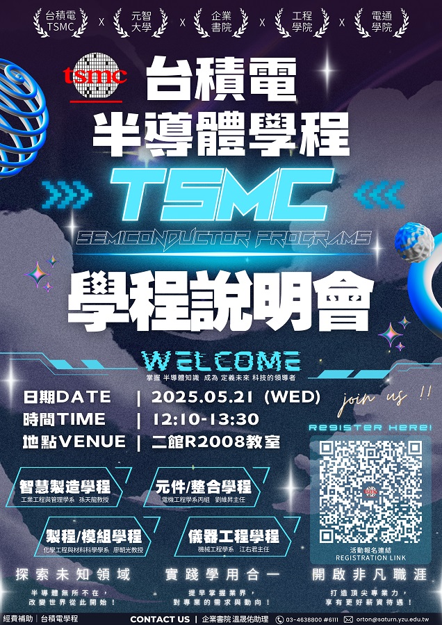 為促進學用合一,強化有志進入半導體產業學子的核心競爭力,元智大學與台積電共同攜手規劃「半導體學程」,當日會介紹「智慧製造學程」、「元件/整合學程」、「製程/模組學程」和「儀器工程學程」相關課程說明,歡迎同學們把握報名機會,千萬不要錯過啦~