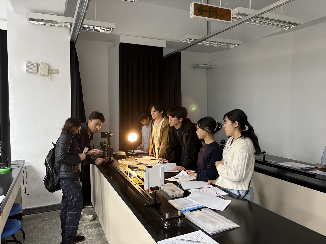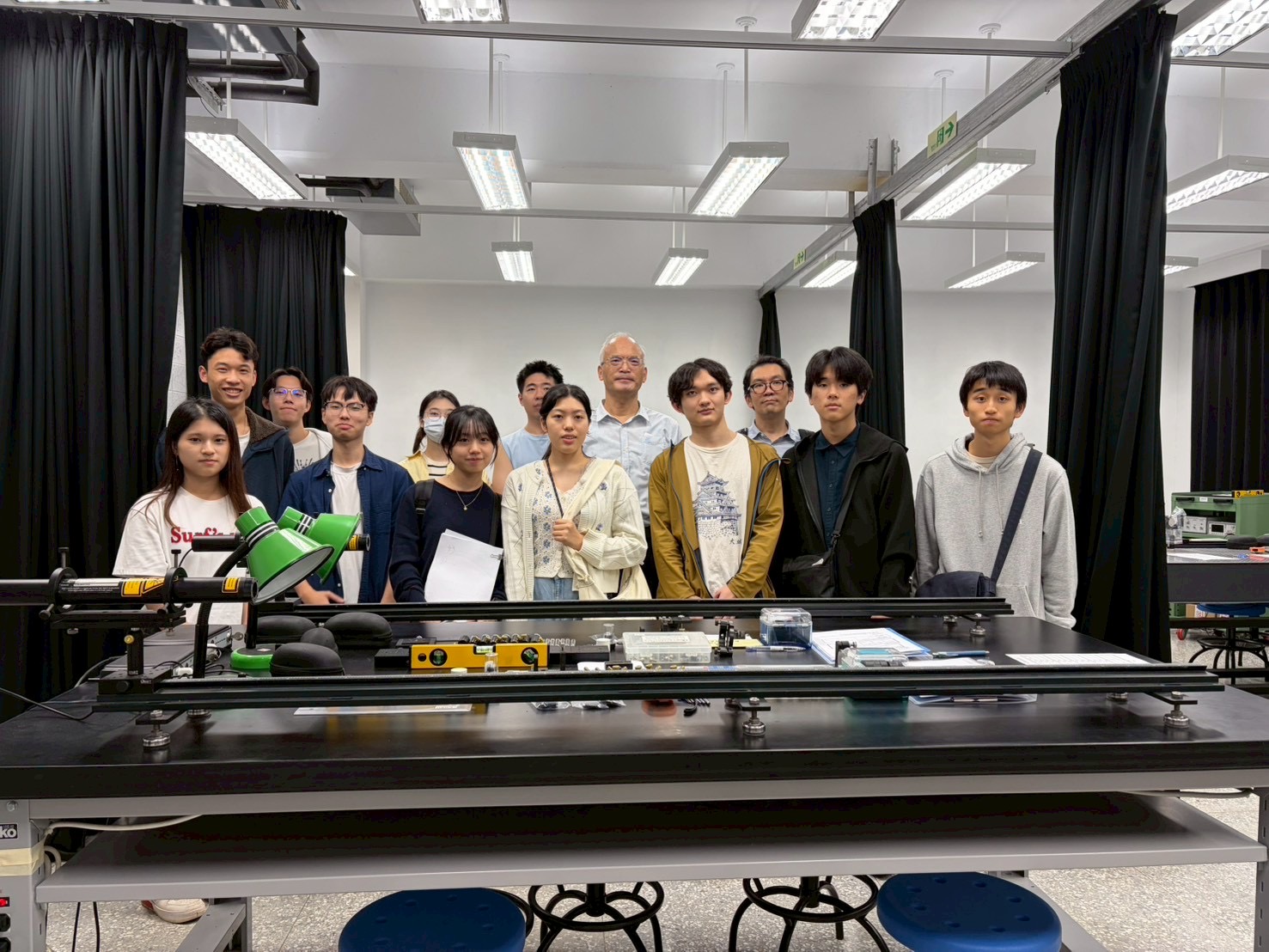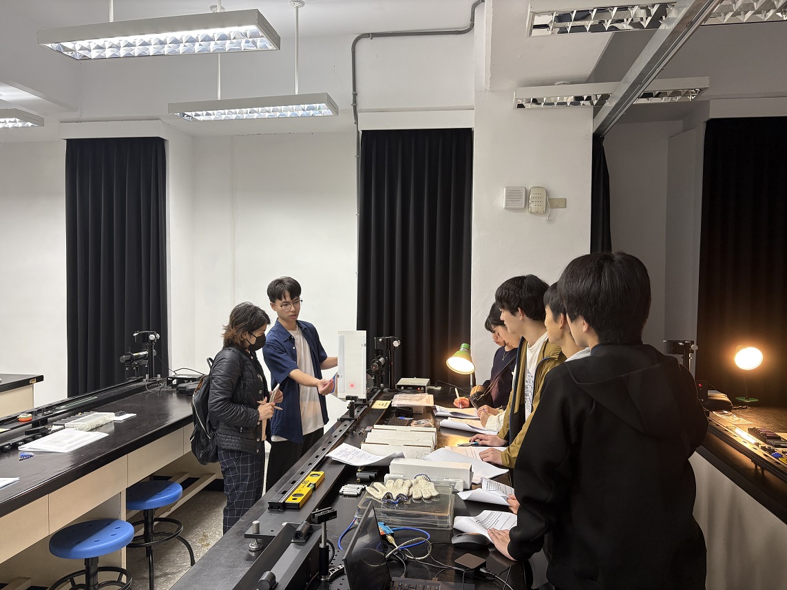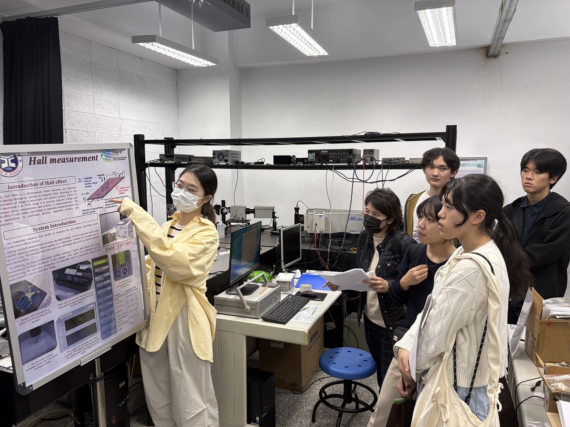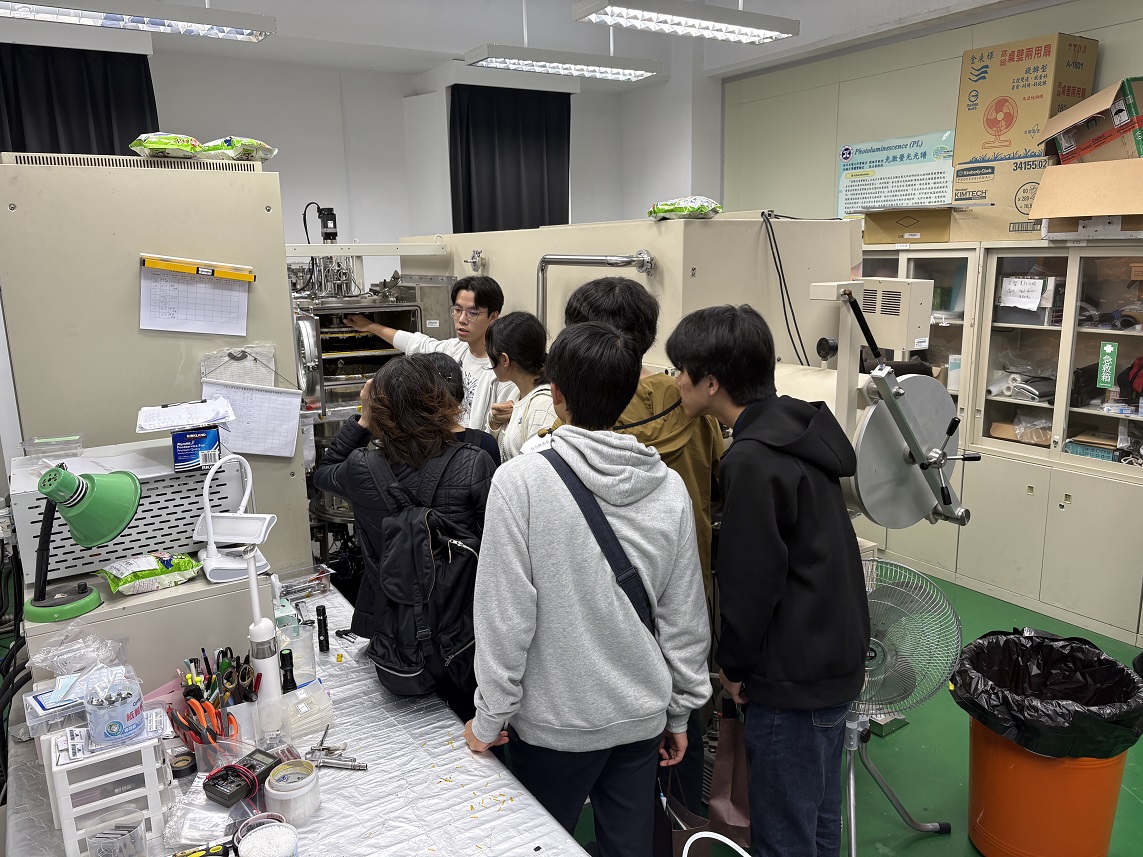 來訪團隊參觀有機與無機蒸鍍設備、濺鍍系統、橢偏儀、半導體 I–V 量測平台及霍爾效應量測系統,並親自操作本系幾何光學、物理光學與光電實驗課程。