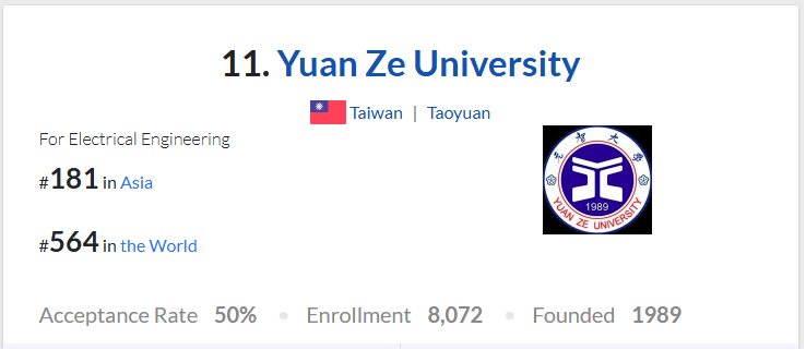YZU Department of Electrical Engineering Ranks #11 Nationally in EduRank