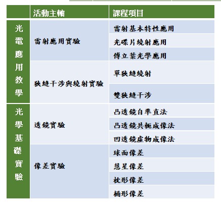 本營隊活動包含光電應用教學與光學基礎實驗兩大主軸,當日觀看實驗操作影片與線上講解實驗項目。